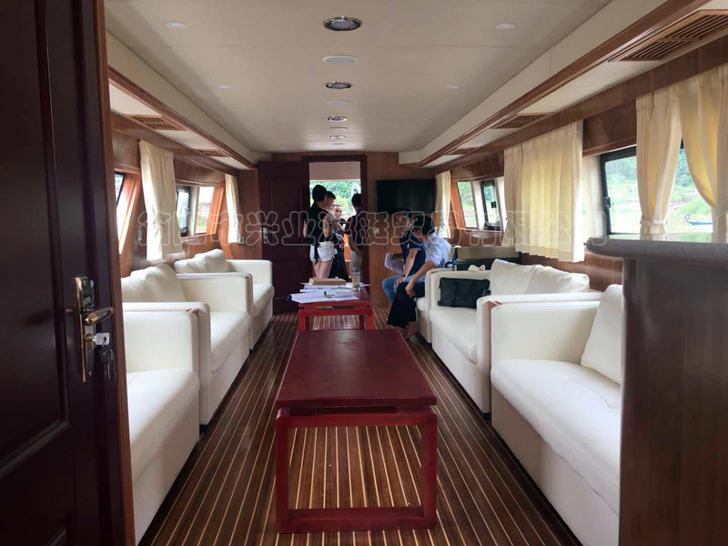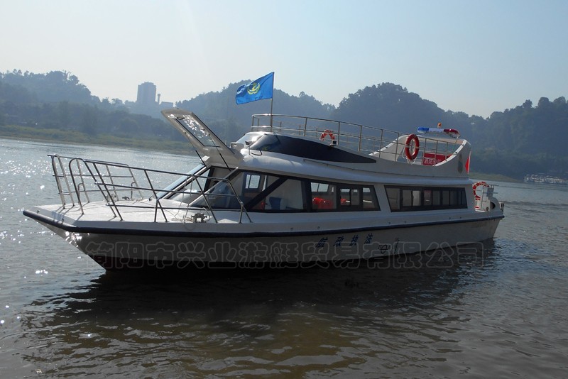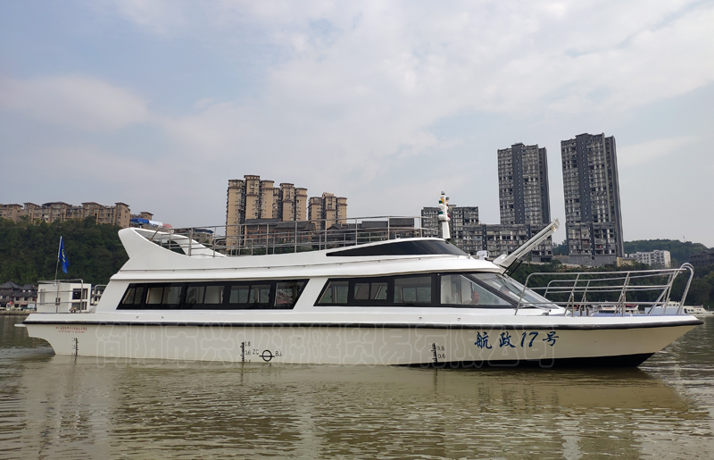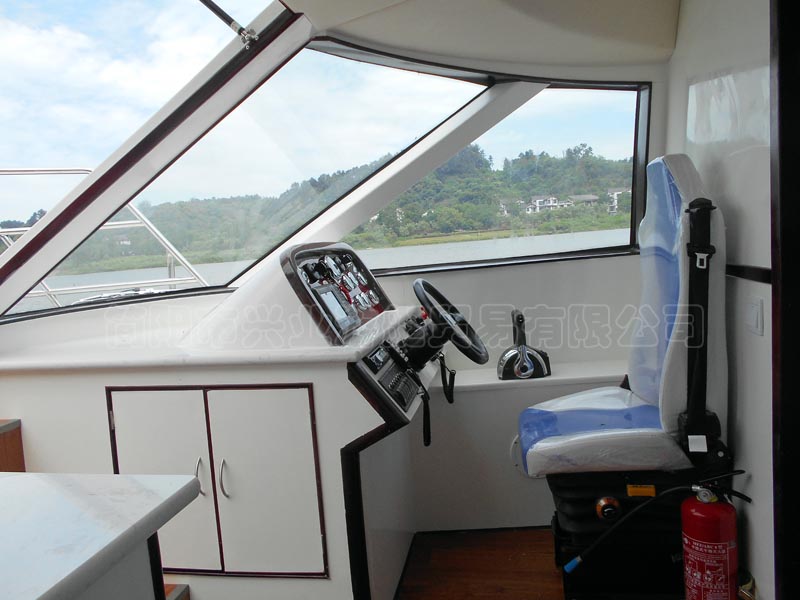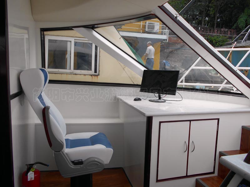 本艇為玻璃鋼材質建造,外表面為彩色膠衣樹脂,玻璃鋼原材料為:船用不飽和聚酯樹脂、無堿無捻方格玻璃布,無堿短切玻璃氈,上述產(chǎn)品均為船級社認可產(chǎn)品。本艇艇本為縱骨架式結構,艙壁為玻璃鋼內膽,甲板設防滑毛面,本艇上層結構殼板為陰模成型。本艇一層為客艙,設有座椅可供執(zhí)法人員乘坐,二層設有露天執(zhí)法平臺,可供執(zhí)法人員執(zhí)法。