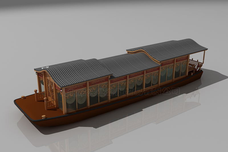本船為玻璃鋼船體,上層木質(zhì)畫舫結(jié)構(gòu),采用單體折角艇體線型,在艉艙內(nèi)布置2臺進口環(huán)保型高轉(zhuǎn)速舷內(nèi)外柴油機推進裝置作為本船的動力,通過設(shè)于艉封板外的舷外艉機(或螺旋槳、軸系)的左右轉(zhuǎn)動,達到操舵的作用,是水上旅游、觀光、娛樂的理想選擇。